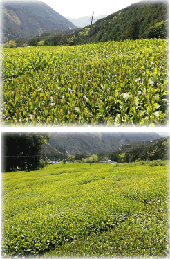 手前の整然とした畝の茶園と比べるとその様子の違いがはっきりしますね。まるで亀の甲羅のようです。