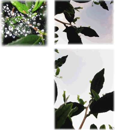 左上の画像は茶園の中にあった蜘蛛の巣に水滴がついた様子。わざとピントをぼかし気味に撮ると面白い画像となることがあります。