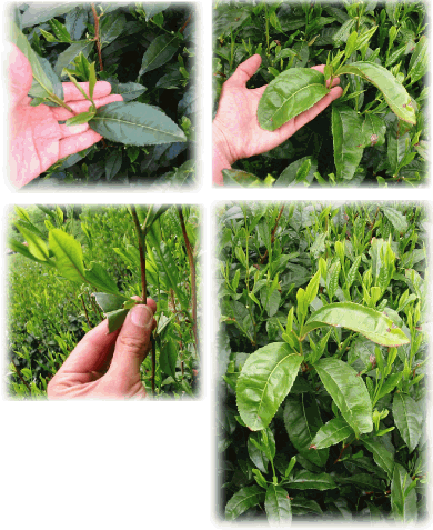 画像左上は自然仕立て園のやぶきたの「親葉」です。いわゆる「芽重型」の究極的な形ともいえる栽培でもある自然仕立ては新芽を育てる親葉の大きさが特長のひとつです。